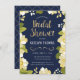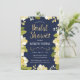 Este chá de panela moderno e bonito apresenta uma fronteira floral ilustrada e as palavras "Chá de panela" em ouro. O plano de fundo é uma cor azul marinho, mas pode ser personalizado para qualquer cor que você escolher. O verso do convite inclui um padrão de quatrefoil dourado com um fundo azul correspondente que também pode ser trocado. O texto é personalizável para o seu evento especial de celebração pré-casamento.