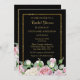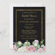 Um elegante chá de panela floral com rosas românticas cor-de-rosa contra um fundo preto, enquadrado com uma borda glamourosa, brilhante e brilhante, de ouro. Personalize adicionando o nome da noiva-a-ser e os detalhes da festa. Imagem impressa plana, NÃO com brilho real.