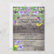 Flores silvestres, frágeis e pintadas por aquarelas — amanteparo, trevo, gerânio florestal, trevo vermelho, vagabunda, palito — criem um convite exclusivo para o seu evento. Eles estão em tons predominantemente azuis e amarelos. Uma sensação rústica é criada por um fundo de conselhos meteorológicos. Uma fonte de script e uma fonte de bloco de contraste presentes em preto para que os detalhes do evento sejam facilmente lidos. No verso está um arranjo de botões e flores de gerânio pintados pela mão roxa.