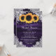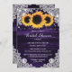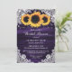 Bonitos convites de chá de panela de roxo rústico e girassol com fundo de madeira rústica adornados com flores de girassol, rendas florais brancas e luzes de cordas. Itens correspondentes disponíveis.