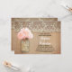 Chá de panela rústico bonito com jarro de mason com flor de hydrangea rosa. Convite perfeito para chá de panela de campo com local de colheita e sotaques de madeira em apuros.
