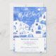 Uma pintura aquosa moderna da cidade pitoresca de Oia, na ilha grega de Santorini, para celebrar com um toque de elegância e beleza. Inspirados pelas impressionantes vistas da ilha, esses convites apresentam uma pintura aquosa mesmerizante de Oia em tons azuis e brancos sonhosos. Arte original de Nic Squirrell.
