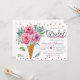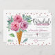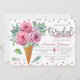 Chá de panela com cone de sorvete cheio de buquê de flores rosadas e folhas verdes e pontos brilhantes cor-de-rosa.