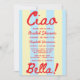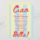 Trendy Stripes com Letra manuscrita em Chá de panela sunset italiano amarelo-manteiga, azul-claro e coral profundo - Defina o tom para um chá de panela divertido, chique e inesquecível com este stripes italiano azul e amarelo com tema e com Ciao Bella manuscrito em um convite para chá de panela laranja. Um simples e clássico convite para chás de panela do tema Itália, com um fundo listrado azul e amarelo. A frase "Ciao Bella", Olá Bela em Italiano, é escrita em moderno e tradicional escrita à mão. Perfeito para primavera ou chá de panela de verão. Personalize este modelo de convite adicionando seus próprios detalhes de evento. Também disponível como download digital instantâneo, perfeito para envio por e-mail, texto ou mídia social.