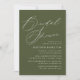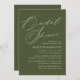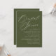 Convites de chá de panela simples com "Chá de panela" apresentado num roteiro de caligrafia branca com fundo verde-oliva. Personalize os convites de chá de panela verdes de oliveira com o nome da noiva e os detalhes do chá abaixo. O chá de panela moderno convida a inverter a sua posição para mostrar um fundo verde-oliva sólido.