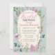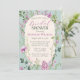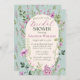 Design personalizável moderno, elegante e feminino para um chá de panela com flores silvestres delicadas de campo de cor d'água e verde em cores verdes e roxas claras sábias com um padrão uniforme floral correspondente no verso.