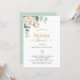Um fundo branco chic. Decorados com uma flor branca, uma flor (pénia) e folhas verdes de eucalipto de cor aquosa, prigos, verde e um purga dourado. Personalize e adicione o nome da noiva a ser e os detalhes da festa. Letras pretas e ouros. Verso: cor verde do fundo.