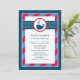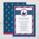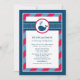Este convite de chá de bebê náutico apresenta uma baleia da marinha amigável com respingos de água em forma de coração, contra um design ousado de bolinhas e listras vermelhas e azuis-marinho. A combinação de cores náuticas clássicas é perfeita para a celebração de um menino. Um padrão de baleia coordenado adorna o verso do cartão. Toda a redação é totalmente personalizável para o seu evento.