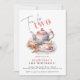 Convites bonitos e de segundo aniversário feminino com tema de festa de chá. O texto do título diz "chá para dois" com uma ilustração de um bule de chá e duas aves pequenas. Os detalhes do seu evento estão escritos abaixo. O verso apresenta uma lavagem com aquarela em rosa-pincel de coordenação.