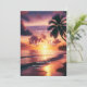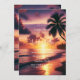 Uma cena de pôr do sol de uma praia impressionante com um céu ouro e roxo, ondas de oceano calmas, e uma silhueta negra de uma palmeira à direita. As matizes quentes refletem sobre a água, criando uma atmosfera romântica e serena — perfeita para um convite de casamento.