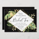 Este elegante convite de festas de chá de chá de panela tropical apresenta uma folhagem exótica com sotaques dourados sobre fundo preto. Um quadro de ouro geométrico moderno destaca o texto negro. As Douradas lâminas acentuam o design botânico e trazem um pouco de sofisticado capricho ao convite. A parte traseira apresenta os detalhes do registro da noiva a ser. Este convite à oásis da ilha é perfeito para qualquer chá de luau, praia ou bridal tropical.