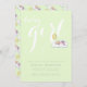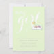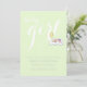 Chá elegante tipografia verde-clara e pálida, convite mínimo com o texto bebê em verde-pálido sobre fundo branco e uma menina de roupas cor-de-rosa com um pouco de azul dormindo em uma nuvem e a lua crescente amarela. Texto na cinza. A parte de trás está coberta por um padrão de bebê. Você pode mudar a cor de fundo. Alguns elementos de Trina Clark.
