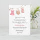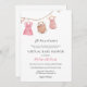 Um chá de fraldas virtual é perfeito quando os entes queridos não podem estar juntos, mas ainda querem chá para que os pais estejam com amor e presentes para se prepararem para a chegada do seu bebê. Este longo Chá de fraldas à distância por correio apresenta uma ilustração adorável de roupas cor-de-rosa para bebês penduradas numa linha de roupa. Personalize com suas informações ou clique em "Clique para personalizar mais" para editar estilos de fonte, tamanho e cores.