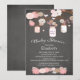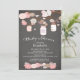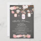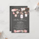 Convite de chá de bebê moderno e trendy com quadro-negro em jarro de pedra com um galho de árvore com belas tonalidades de flores cor-de-rosa e populares jarros de pedra rústicos pendurados com "é uma menina" em um deles. Convite de chá de bebê perfeito e contemporâneo em jarro de pedra para chá de bebê de menina, menino ou neutro. Visite nossa loja para ver nossa bela seleção de convites em jarro de pedra.
