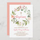 Barato de convites de batismo para bebês impressos. Este bonito design tem uma coroa de água floral com flores cor-de-rosa pastel e verde. Personalize a design com os detalhes da festa Baptism do seu filho. O verso tem uma cor rosa ou você pode usar o espaço para adicionar texto e fotos adicionais. Clique em Personalizar para escolher qualquer cor de fundo e editar as fontes de texto e as cores para criar um convite Baptism exclusivo para a sua bebê.