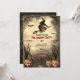 Festa de Halloween divertida e divertida Convocação com detalhes negros de bruxa voadora em uma lua de cheio com seus amigos doidos de abóbora. Pênus de coloração d'água sombrio. É fácil personalizar. Tipografia assustadora na frente e atrás que você pode personalizar. Feliz Dia das Bruxas!