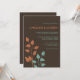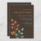 Esses convites de casamento simples, elegantes e modernos estão prontos para personalizar e apresentar dois ramos de folhas, ou ramos de folhas em laranja e chalé em fundo de chocolate. Estes convites para temas galho/folha são excelente para casamentos de outono ou outono.