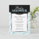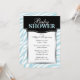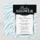 Na moda e impressão zebra exclusiva Convites de Baby Shower com design de cabeçalho de quadro preto sobre um padrão de listras zebra azul e branca e impressão personalizada com detalhes de celebração.