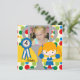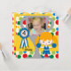 Um cheerleader loiro, troféu de campeonato, com uma área onde você pode adicionar sua foto de cheerleader, uma fita azul, muitas bolinhas coloridas, e áreas que você pode personalizar facilmente com suas características de festa de aniversário, em um convite de aniversário de tema de animação que ela certamente ama!