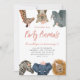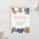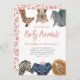 O safari de animais de crianças bonitos e divertidos é um convite de aniversário com ilustração de animais safari de girafa, leopardo-da-neve, rinoceronte, leão, elefante e zebra com flores rosa, coroas e chapéus de festas. O texto diz "chamando todos os animais da festa." Perfeito para a festa de aniversário de uma garota.