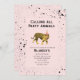 Chamando o tema de aniversário de todos os animais da festa com ilustração do tigre ruivo vestindo um chapéu cor-de-rosa com fundo rosa e design de pintura preta.