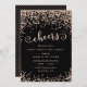Chic, Convite de festas de design de Ano Novo preto moderno, apresentando bolinhas de falso champanhe e brilho de aparência confetti. "Cheers" é escrito em tipografia robusta de escrita escrita escrita com letra de mão. A inscrição temporária preenche os detalhes da festa. [Observe que, embora os elementos desta placa sejam projetados para se parecerem com brilho, não é usado nenhum brilho real ou tinta metálica para criar os convites - o brilho é um efeito impresso.]