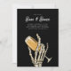 Hospedando um adulto só na cesta de Halloween? Convide amigos com estes convites de chic assustadores com uma mão esquelética levantando um copo de champanhe para um brinde. "Boos e Booze" aparece no topo, junto com os detalhes da festa de Halloween.
