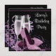 Convites de festas de aniversários cor-de-rosa e preto de uma mulher elegante e divertida. Este calçado de salto alto, rosa e preto, confetti e convite de aniversário de vidro de champanhe é facilmente personalizado para o seu evento, adicionando detalhes de evento, estilo de fonte, tamanho de fonte e cor e texto.