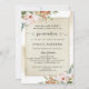 Aprecie seus convidados com este belo convite da quinceañera. Também disponível em espanhol. Convite elegante com elementos caligráficos modernos escritos à mão, buquês de canto floral de cor aquática refinados e champanhe delicado, manchas de cor aquosa de ouro em cascata atrás de um quadro champagne atraente mostrando seus detalhes da quinceañera. Capacidade de adicionar detalhes de cerimônia e recepção, que para eventos sem cerimônia podem ser alterados para detalhes de recepção à esquerda e para detalhes de dança à direita. Detalhes flóricos em uma bela mistura de rosa poeirento, cor-de-rosa-pincel, champanhe, terracota, verde e uma sugestão de tons azuis. De volta com manchas aquáticas em cascata e detalhes florais elegantes no centro com nome quinceañera.