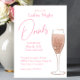 Este convite personalizado apresenta um tema glamouroso de festa Ladies Night Cocktail. As informações da parte são impressas em uma fonte rosa suave, com o título "Bebidas" impresso em um script elegante. Um copo de champanhe espumante de rosa é colocado à direita. A configuração de brilho rosa acentua a parte inferior.