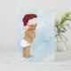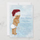 Menino no país das maravilhas de inverno flocos de neve azuis com um adorável príncipe bebê étnico usando um lindo chapeu de Papai Noel vermelho convites para festa de bebê no país das maravilhas de inverno. Este convite de festa de bebê no país das maravilhas de inverno com flocos de neve azuis é facilmente personalizado para o seu evento, basta adicionar os detalhes do evento, estilo de fonte, tamanho e cor da fonte e texto.