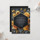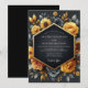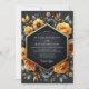 Embrace a dramatic and opulent aesthetic for your special day. This design features a lush arrangement of painterly ochre roses and sunflowers bursting from a deep charcoal background. Muted slate blue blossoms and delicate foliage add depth and sophisticated contrast, creating a stunning baroque-inspired botanical display.