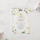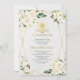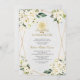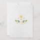 Design de cartão elegante, com flores brancas delicadas e folhas verdes, cor d'água, um chalice brilhante a dourado falso, quadro transversal e poligonal dourado, sobre fundo de papel de aquarela. Na parte de trás, buquê de flores brancas, cálice de ouro e iniciais. Use a ferramenta Personalizar para adicionar suas informações, alterar fontes, cores da fonte. Para encontrar itens, por favor, visite minha encantadora coleção de eventos religiosos.