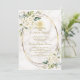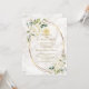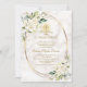 Design de cartão elegante com cor d'água, flores brancas delicadas e folhas verdes, falso quadro oval dourado, cruz falsa dourada, cálice, sobre fundo de mármore. Na parte de trás buquê de flores brancas no mesmo mármore. Use a ferramenta Personalizar para adicionar suas informações, alterar fontes, cores da fonte. Para encontrar itens, por favor, visite minha Santa Coleção de Comunhão.