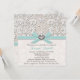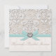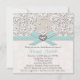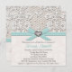 O laço do vintage e a serapilheira fina de linho olham convites nupciais com um fundo antigo subtil do damasco do Victorian e uma fita azul e um arco impresso da hortelã do aqua, um coração impresso do diamante e do cristal de rocha e um design da pérola. Este convite do chá de casamento pode ser personalizado com o nome do evento na parte de trás deste elegante e ladylike convide. Criado e projetado por Chrissy H. Estúdio, LLC. Todos os direitos reservados.