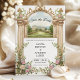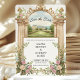 Este convite apresenta um majestoso castelo de jardim emoldurado por detalhes arquitetônicos em aquarela e flores exuberantes em aquarela em azul, marfim e rosa. As colunas e o arco ilustrados criam uma moldura graciosa, guiando o olhar para os seus nomes e detalhes do evento. Perfeito para casais que amam flores românticas e arquitetura elegante, este design pode ser personalizado com seus nomes, data e local. Escolha seu papel favorito e personalize o verso para criar um Save the Date que seja atemporal e exclusivamente seu.