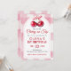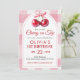 Editable cherry bow birthday invitation. Features a watercolor cherry with a pink bow, and a gingham pink and white background.