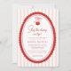 Cherry on Top Coquette Bow Pink Baby Shower Invitation - An adorable design featuring a hand drawn cherry hanging from a coquette bow with hand written and modern typography. The background is trendy pink and white stripes, the perfect way to celebrate your little one. Our easy to use template makes it so easy for your personalize your invitation. Cherry on top Coquette Bow Pink Baby Shower will be part of a Baby Shower Collection.