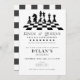 Xeque-mate! Escolha estes convites modernos e elegantes para a festa de aniversário do seu amante de xadrez. O design apresenta ilustrações de peças de xadrez desenhadas à mão e os detalhes do seu partido. O tema é "Kings and Queens, chame todos os seus cavaleiros, pois os jogos estão prestes a começar!"