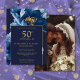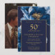 Este elegante convite de aniversário de casamento de 50 anos em azul marinho e dourado floral pode ser personalizado com suas informações em tipografia moderna e uma foto especial no verso. Criado por Thisisnotme©
