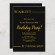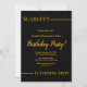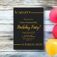 Este elegante convite de Aniversário preto e dourado é perfeito para um Aniversário moderno. o simples design apresenta uma elegante caligrafia dourada num fundo preto.