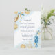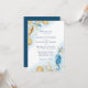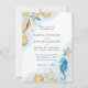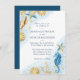 Coleção de casamento sofisticada de cor azul e dourada "sol, areia e mar". A design apresenta conchas, estrelas-do-mar, um cavalo-marinho e recifes de coral em elogios a tons de azul, ouro e de branco com uma abertura de azul para um efeito de água. Os detalhes do seu evento, em marinho azul, são enquadrados pela fronteira náutica da garland, de coral marinho elegante, conchas e estrelas-do-mar.