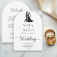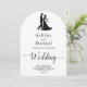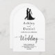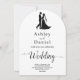 Este elegante convite de casamento de Arco Negro e Branco é perfeito para um casamento moderno. O simples design apresenta uma caligrafia preta elegante e uma ilustração noiva e noiva sobre um fundo branco limpo. O cartão de convite inclui os detalhes do casamento no verso, em vez de pagar um cartão separado.