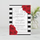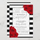 Estes Convites de aniversário chic e na moda surpresa apresentam um elegante falso quadro de folha de alumínio prateado em faixas preto e branco de tendências com rosas vermelhas e uma tipografia moderna que é perfeita para celebrações de qualquer idade. Personalize facilmente o design com seu próprio texto e encontre itens correspondentes em www.zazzle.com/invitation_republic.