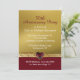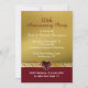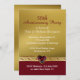 Convite de festa de aniversário de casamento dourado elegante feito em um fundo de tom dourado, com uma faixa vermelha rubi na parte inferior. Gráficos de uma fita de jóias dourada e rubi atravessam o convite, entre os dois fundos, e são decorados com gráficos de um grande coração de rubi, no meio. Personalize o texto branco e vermelho para as necessidades da sua celebração.
