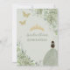 Este convite para a Quinceañera apresenta uma imagem geométrica brilhante de ouro enfeitiçada por delicada cor d'água, verde verde, verde de sábio macio e uma garota com um lindo vestido verde de sábio. Personalize-o com seus detalhes de forma fácil e rápida, basta pressionar o botão personalizar para reorganizar e formatar o estilo e a colocação do texto. Também excelente para Sweet 16! c) O Feliz Cat Studio