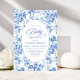 Create a timeless first impression with this baby shower invitation featuring elegant French toile de jouy roses in refined shades of navy blue, royal blue, dusty blue, and deep blue, inspired by classic chinoiserie floral design. This sophisticated style blends heritage elegance with modern charm, making it perfect for a memorable baby shower celebration.