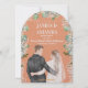 Romantic watercolor wedding invitation featuring a bride and groom with soft floral greenery frame on a warm terracotta background. Perfect for rustic, boho, and garden weddings. Printable template.
