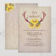 Convite de festa de aniversário rústico de verão ou outono no campo com chifres de veado, flores de respiro de bebê brancas, fundo de madeira e buquê de girassóis.
