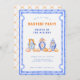 Este convite de festas de Colheita tem uma design de chinoiserie apresentando três frascos diferentes de gengibre. A borda ao redor dos convites é um quadro de bambu azul. Você pode editar o texto para atender às necessidades do seu evento. As costas têm um padrão coordenado de bambu.